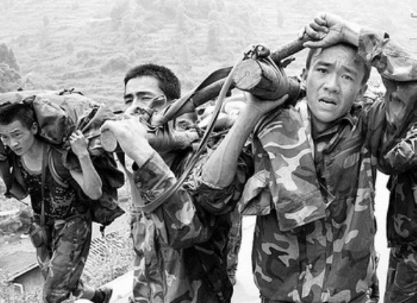 5月17日,一群满头是汗的解放军官兵抬着受重伤的灾民前往安全地带。汶川地震发生后,四川省青川县曲河乡道路被毁、通信中断,受重伤的灾民滞留深山,生命危在旦夕。成都军区驻红河州某部官兵,在险情不断发生的崎岖山道上,抬担架步行,将6名重伤灾民安全转出,送往医院接受治疗。新华社记者陶 明摄