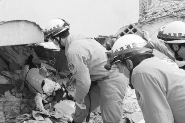 5月18日,北京消防救援队员利用救援犬在北川县城的废墟中搜救。当日,在汶川地震重灾区北川,解放军、武警官兵和预备役救援人员一起冒着危险,继续在废墟里搜救并进行清理工作。