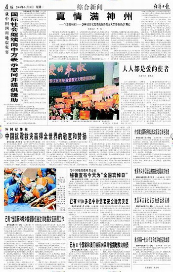 现场屏幕上灾难的场景触目惊心,但一个个灾区同胞、人民教师舍生取义的感人瞬间,人民军队不畏艰险、舍己为人的英雄壮举更是催人泪下。一轮又一轮的捐款高潮出现在募捐活动现场。宣传文化系统各条战线的代表,竞相上台把饱含爱心的捐款投入捐款箱。主持人动情地说,“一笔笔善款可以帮助我们的灾区人民改善他们的生活、重建家园,一句句温暖人心的话语能够在精神上帮助他们渡过难关。”