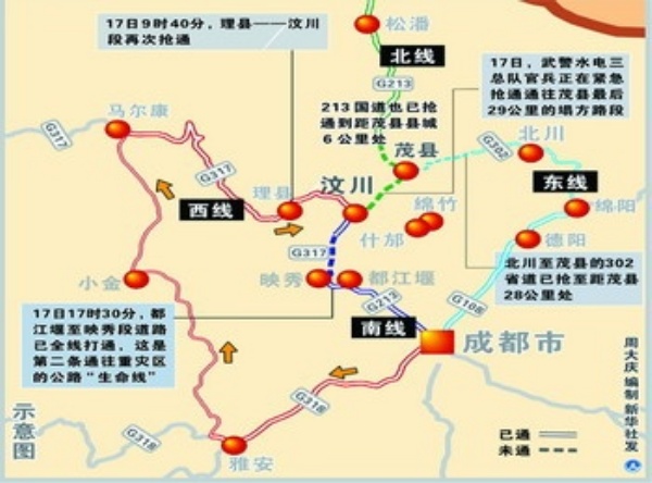 15日21时30分传来消息:经过4000余名交通职工70多个小时的奋战,国道317线全线抢通。这一从成都经雅安、小金、马尔康、理县直达汶川的600多公里的“生命线”,成为第一条到达灾区震中汶川的公路通道。