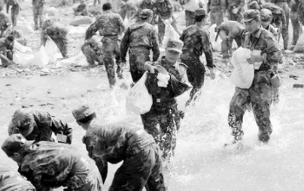 5月18日,空降兵某部官兵在传送石袋扎桥墩。空降兵某部官兵自5月13日进入地震重灾区平武县南坝镇后,全力抢险救灾。由于南坝镇和外界被一条湍急的河流阻断,这支空降兵抗震救灾部队克服重重困难,在急流上用竹排紧急架设一座“生命桥”。 新华社记者 杨 磊摄