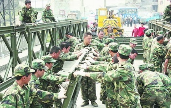 5月16日,来自雅安市的应急公路工程抢修分队在汶川寿江大桥上架设装配式钢桥。