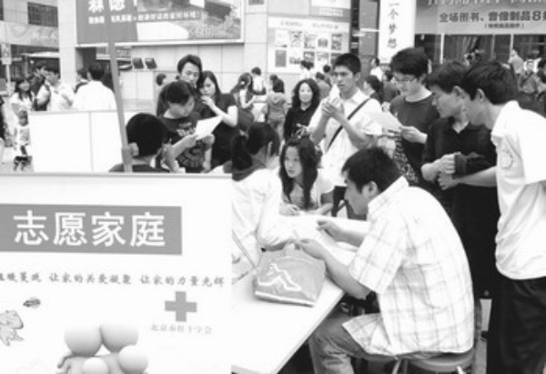 5月20日,全国哀悼日进入第二天。北京王府井商业街上,由北京红十字会发起的收养地震灾区孤儿、孤寡老人并与他们组成志愿家庭的活动,引起许多路人驻足,详细询问相关情况。 本报记者 邓 维摄
