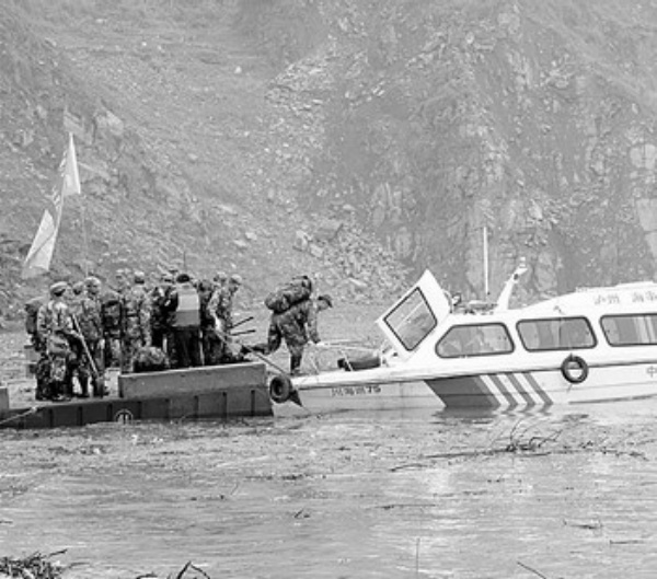 四川汶川地震发生以来,海事部门投入了100多艘船艇参与抗震救灾。图为海巡艇在运送救援战士。 交通运输部供图