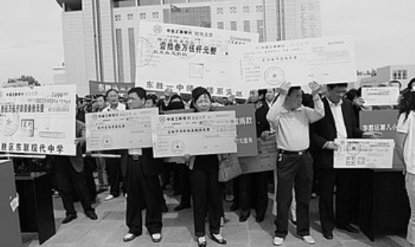 汶川大地震发生后,内蒙古自治区鄂尔多斯市东胜区各界群众纷纷来到设立的统一捐助点积极捐款。几天来,已为地震灾区捐款4500多万元。