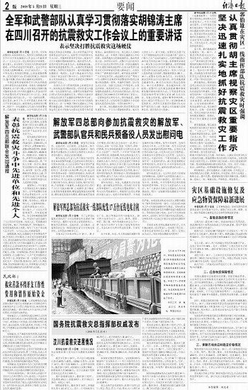 全军和武警部队认真学习贯彻落实胡锦涛主席在四川召开的抗震救灾工作会议上的重要讲话