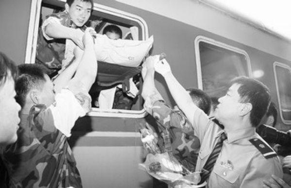 5月21日7时许,246名由四川地震灾区转运来的伤员抵达西安,近千名医护人员、志愿者和铁路职工热情迎接。首批伤员将全部被安排到第四军医大学西京医院和唐都医院。图为人们将伤员抬下车。