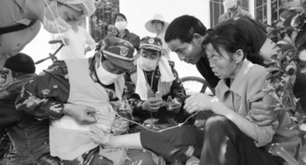 在四川省绵阳市安县,天津消防突击救援队的随队医生正在为受灾群众缝合受伤的右脚。天津消防突击救援队是14日抵达安县的。