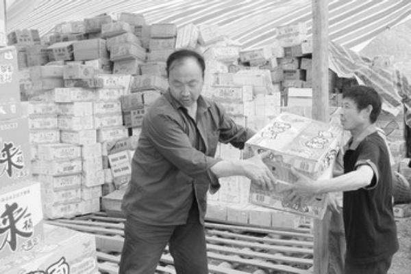 图为在平武县平通镇公路旁临时的一块受灾群众集散地,石坝村的村委会主任焦江、李家坝村民小组组长李孝文带领10多名村民领取救灾物品。 本报记者 任 芳摄