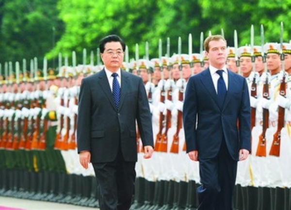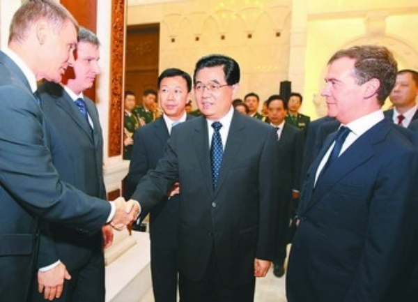 会谈前,胡锦涛主席在人民大会堂东门外广场为梅德韦杰夫总统访华举行欢迎仪式。全国人大常委会副委员长、秘书长李建国,国务委员戴秉国,全国政协副主席李兆焯,九三学社中央常务副主席陈抗甫,外交部长杨洁篪,教育部长周济,商务部长陈德铭,中国驻俄罗斯大使刘古昌等出席欢迎仪式。