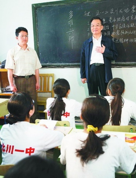 随后,温家宝走进高三(一)班的临时教室,黑板上写着“历史:五·一二汶川大地震涉及的相关专题”等字样,一位中年教师正在上课: