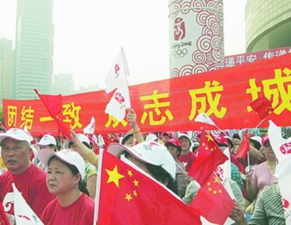 前来参加奥运火炬传递起跑仪式的上海市民打出赈灾标语迎接圣火。 本报记者 李丹摄