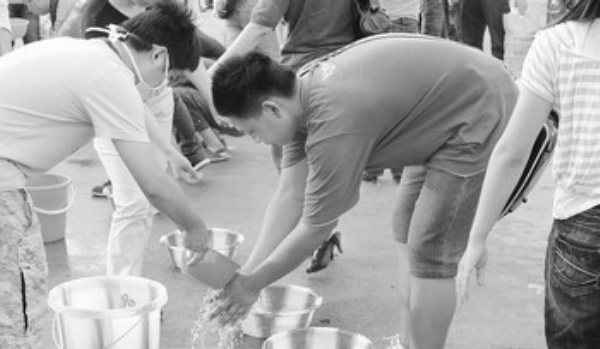 灾区的工作人员用消毒药物洗手清洁。为实现大灾之后无大疫,目前四川灾区采取了多项严密措施,防止疫情发生。 本报记者 李景录摄