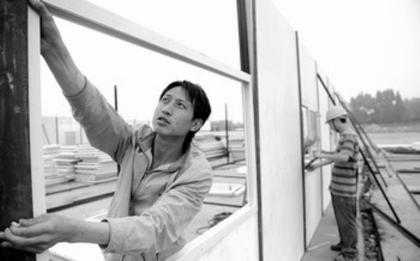 5月25日,四川都江堰受灾群众安置点的工人正在抓紧施工建起活动板房。 本报记者 李景录 任芳摄影报道