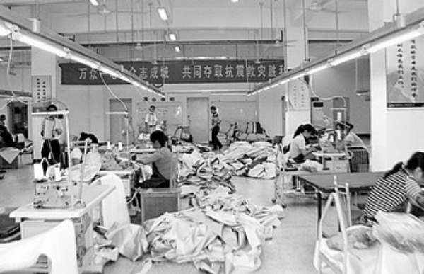帐篷生产车间灯火通明,缝纫机在飞速转动,工人们正在紧张地忙碌着。车间里没有人说话,只有机器转动的隆隆声,墙上“万众一心抗震救灾”的横幅格外醒目。运输帐篷的车辆在厂门口待命……