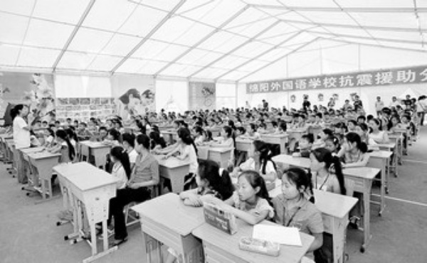 在绵阳九洲体育馆外有一所由20多顶帐篷组成的学校,970多名来自北川等重灾区的孩子们在这里重返课堂。 新华社记者 朱峥摄