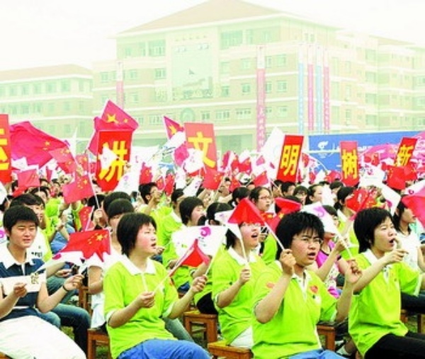在起跑点,泰州中学的学生们挥舞旗帜为奥运圣火加油。