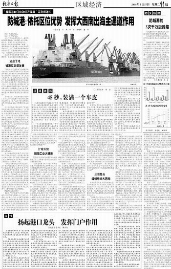 防城港的发展正向更广阔的经济腹地延伸。防城港长期以来外贸货物占总吞吐量80%左右,是西南港口中对外贸易度最高的港口,国际中转运输业务潜力巨大。谭秋贤给我们提供了一组数字:2006年,西南地区企业在广西口岸进出口货物1311万吨,比2005年增长29.5%;西南地区在广西口岸的进口几乎全从广西沿海港口输入,绝大部分的出口也通过沿海港口销往国际市场。防城港口岸在其中占了近70%。