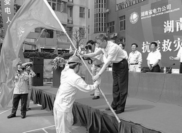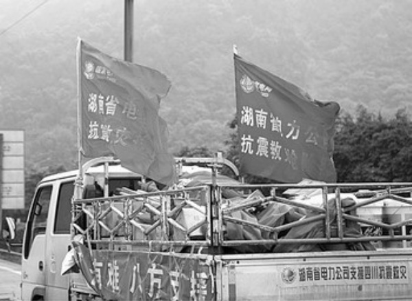 湖南电力的救灾人员和设备,给当地受灾群众带来些许安慰。这支队伍,总共400多人,携带了发电机22台,发电车6台,总功率为6000千瓦,按每户100瓦的容量来算,可使6万户家庭恢复光明。其中大部分设备都是冰灾期间全国各地支援给郴州的设备,这次,抱着回报社会的感恩之情,郴州电业局将它们全部带上了。先期赶到的120多人,主要为保障紧急电力供应,紧急供电对象为医院、通讯站、水厂和救灾现场及陆续抵达的主力部队,重点为恢复灾区供电完成抢修任务。于5月17日抵达的变电抢修分队,主要是承担绵竹等5座220千伏和500千伏变电站的抢修,这支队伍的主体是由冰灾中屡建奇功的湖南省送变电公司和超高压局的员工组成,冰灾涌现出来的抗冰英雄就产生在送变电公司,该公司曾被湖南省委、省政府命名为“电建铁军”。