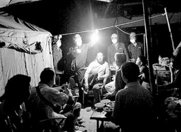 救灾突击队经过1500公里强行军,于15日晚抵达绵竹,先期到达的湖南省电力公司副总经理黄强安排一部分人安营扎寨,另一部分人则来到东方汽轮机厂救援现场了解发电机作业情况。在那里,抢救工作正紧张进行。整个汉旺镇一片漆黑,只有东汽的灯火将废墟照射得如同白昼,保证了抢救工作顺利开展。