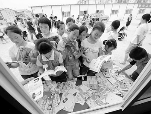 5月27日,四川都江堰赈灾学校的学生正在翻阅书籍。该学校为了丰富灾区学生的文化生活,开设了“流动阅览室”。