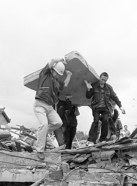 在抗震救灾一线,新疆特变电工志愿者积极帮助灾区群众抢救财物。
