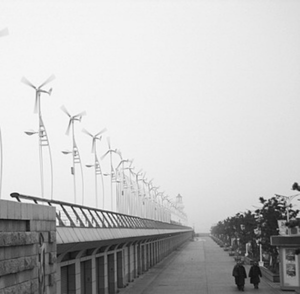 奥帆中心临海而建,阳光、海水和风等天然能源都非常充足。记者看到,在长500多米的防波堤上,矗立着41盏风能灯,迎风呼呼转动的风车,不经意间成了奥帆中心的亮丽景观。据了解,每盏风能灯每年能节电6570度。另外,整个奥帆中心还安装了168盏太阳能景观灯。