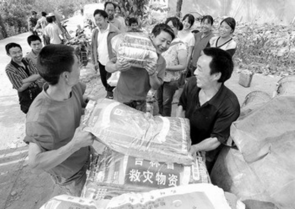 5月28日,四川绵阳平武县南坝镇受灾群众正在领取救灾物资。 该镇严格把关,使救灾物资落实到位,发给受灾群众。
