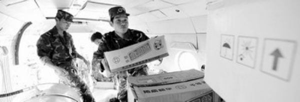 上图 5月28日,四川绵阳机场,济南军区驻渝陆航某团官兵正在将各地送来的救灾物资,紧急送往汶川、茂县等地。