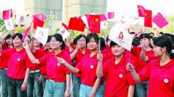 安徽师范大学学生任凤凤拿着国旗,她说:“百年奥运梦,今日终成真。中国举办奥运会,更增强了中国人的自信心和自豪感!”