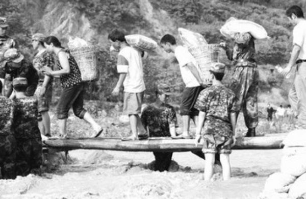 五月二十八日,在四川绵阳执行抗震救灾任务的解放军某部指战员,为受灾群众架桥修路。连日来,当地因堰塞湖泄洪导致交通不便,指战员们克服困难及时架设便桥,为受灾群众提供方便。 本报记者 李景录摄
