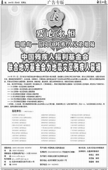 中国残疾人福利基金会联合地方基金会为地震灾区残疾人募捐