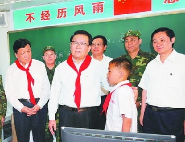 李长春十分惦念灾区少年儿童学习和生活情况。他来到八一帐篷学校,看望正在这里上课的小学生。在一间宽敞的教室里,孩子们正在上计算机课。李长春走进教室,少先队员给他戴上了红领巾。当听说12岁的北川县禹里小学六年级学生熊弼呈在地震中奋不顾身救出两个同学时,李长春称赞熊弼呈是了不起的小英雄。他动情地说,在这场大灾难中,灾区少年儿童经受了巨大的伤痛,也表现出了超常的勇气和力量,有的不顾自身安危抢救同学,有的在危难之中坚持学习,有的在困难面前保持乐观,从你们身上,我们更加深切地感受到了这一代少年儿童的优良品质,看到祖国未来大有希望。