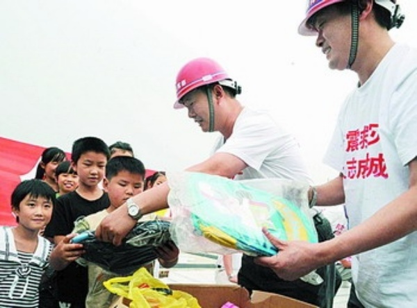 5月31日,在四川崇州河北保定援建四川灾区指挥部工地,河北建设集团的几名员工正在为崇州街子镇唐公社区的孩子们赠送学习用品。