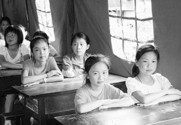 图为孩子们在帐篷小学里认真听老师讲课。