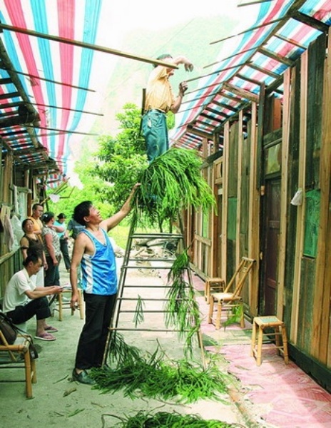 厨房旁边的凉棚就是村民们的餐厅,门板铺在叠起的砖头上成了饭桌,几块长条木板搭成条凳。