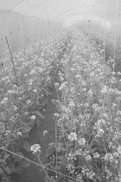 胶州市东茂蔬菜研究所内,纱棚下的胶州大白菜亲本材料植株花开正盛。