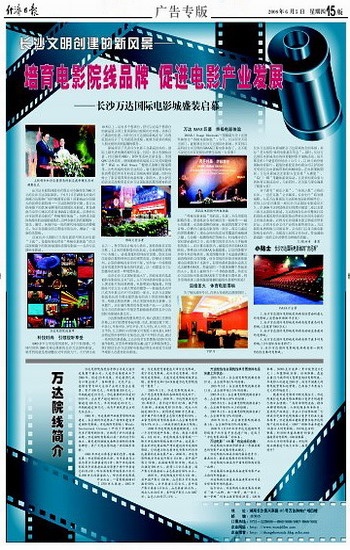 由万达电影院线股份有限公司全额投资7000万元的长沙万达国际影院,于6月1日在湖南长沙黄兴南路万达购物广场四楼盛装启航!该影城由中国最大的民营电影院线————万达院线投资兴建,是万达院线旗下的第30家跨省的连锁国际电影城。更是湖南乃至华中地区的首家IMAX巨幕影城。这将给长沙市民带来全新的“终极视听体验”,也将成为国际标准化的高端影城典范。这种全新打造的集购物、娱乐、餐饮、休闲四位一体的现代休闲娱乐消费模式,为正在创建全国文明城市的长沙,增添了一道新的风景线。