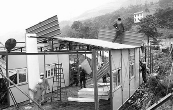 图一 文创板房公司的专业技工日前在灾区加班加点搭架安装活动板房。 本报记者 李江天摄