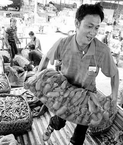 图二 农业部定点农副产品市场————四川彭州蔬菜批发市场,来自自贡地区的菜商李运辉正将从这里采购的鲜菜装车。彭州是蔬菜大县,随着道路等基础设施逐渐恢复,近几天来此进货的菜商日渐增多,销量也趋于正常。 本报记者 李景录摄