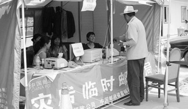 图三 都江堰市规划在2公里长的都江堰大道上,为农行、工行、交行、中行、建行、农村信用社、邮政储蓄、证券公司、保险公司等建设面积总计4500平方米的“板房金融区”。图为都江堰街头的“帐篷邮局”正在为顾客办理邮政业务。 本报记者 李江天摄