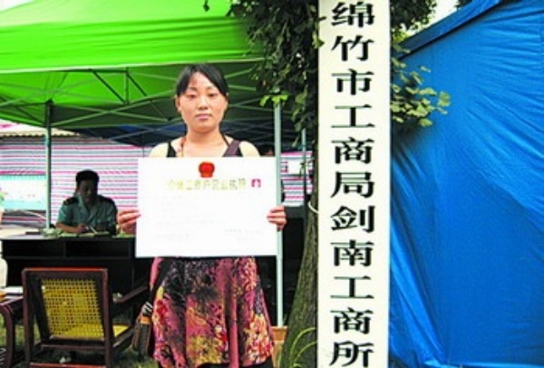 谭月燕是重灾区绵竹市汉旺镇普安村村民,地震后被转移到绵竹市区人民公园安置点。“我不能光等着救济,要自力更生,得有事情做!”她说,“我结婚前在城里帮人家卖过服装,人家还夸我能干呢!”住进安置点,她发现城里的人突然多起来,又觉得自己不能闲着,“我就想,自己还有几千元钱,可不可以办个服装摊位,自己养活自己?要是成了,我爸爸和家里的人也就都有事可做了。所以6月5日我到工商局问了问,没想到今天就办下营业执照了。”