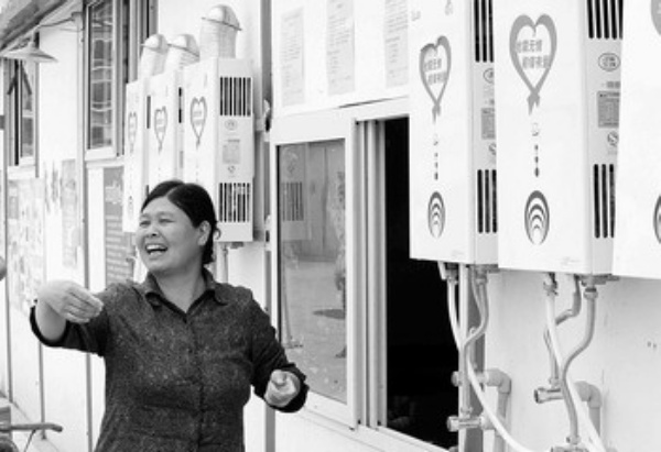 6月6日,四川都江堰市,地震受灾群众安置点“幸福家园”里,刚刚为大家装上了燃气热水器。贾学良大妈说:“太感谢了,我们在这里不但住的吃的都很好,还能洗到热水澡,政府想得真周到!”本报记者 李景录摄