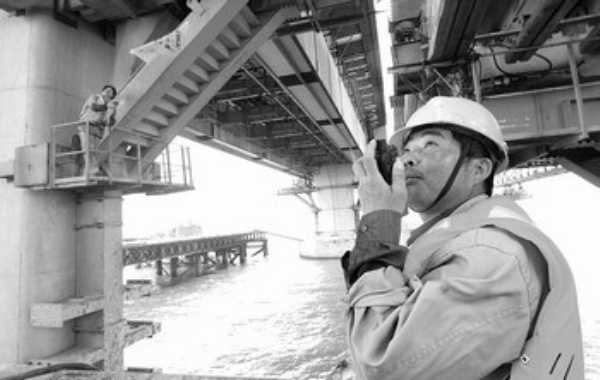 5月30日,建设者在监测架桥机进行合龙段的施工。 当日,经过中铁二十四局集团建设者连续13小时不中断浇注,建设中的上海长江隧桥B1标段最后一孔混凝土箱浇注完成,标志长江隧桥浅滩段与江中段顺利合龙,为整个大桥6月底实现结构贯通奠定了基础。长江隧桥工程起自上海浦东,经长兴岛,止于崇明岛,全长约25.5公里。新华社记者 陈 飞摄