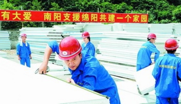 6月9日,河南省南阳市对口援建四川绵阳安县安昌镇地震灾区过渡安置房建设工地,由河南天工建设集团有限公司承建的一期过渡安置房建设工程正在紧张施工。 本报记者 李景录 李江天摄