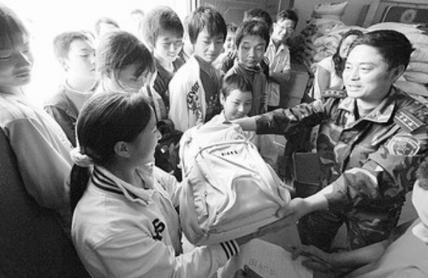 6月10日,四川绵阳市平武县平通镇,四川达州陆军预备役炮兵旅官兵正在给学生们发放书包等物品。到目前,该炮兵旅已捐款22万元用于当地学校修建。