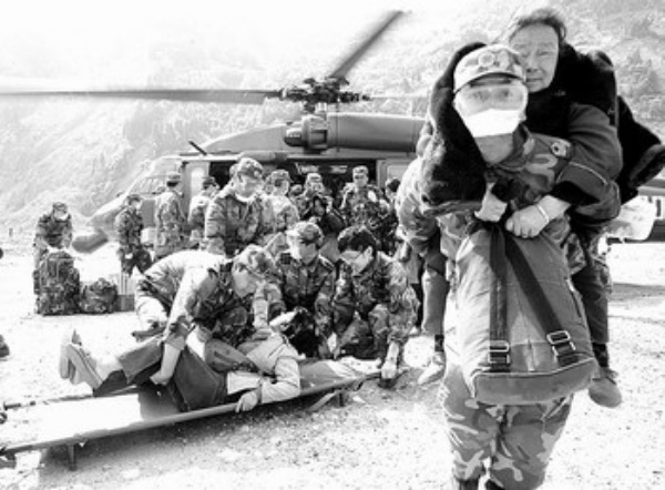 上图 在四川灾区执行抗震救灾任务的北京军区总医院医疗救援队医护人员正在转运伤员。