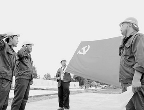 左图 河北建设集团承建的河北保定市对口援建四川崇州灾区过渡板房建设工程工地上,该集团二分公司党总支书记魏玉锁(右一)在工地组织入党宣誓活动。水暖技术员王海波(左一)、土建工长崔玉东(左二)因工作表现突出而在抗震救灾一线光荣加入中国共产党。