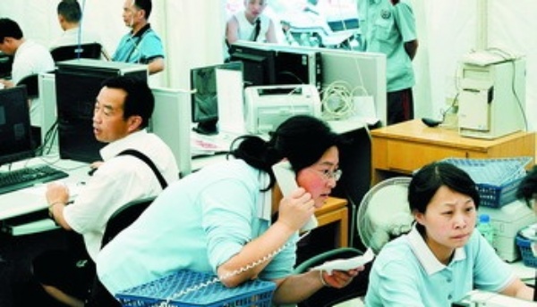 6月3日,四川都江堰市工商银行某临时营业点,银行员工正仔细、耐心地为受灾群众查找存款记录,办理挂失手续等。与老百姓生活密切相关的银行业务快速恢复,使受灾群众的生产生活有了切实保障。