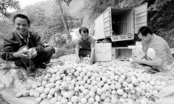 6月2日,广西河池市天峨县八腊乡群众在路边收桃准备装车。我国重点水利工程龙滩电站所在地的广西天峨县,近年来加大龙滩库区农业产业结构调整力度,发展桃子种植面积近万亩,年产量达100万公斤,仅此一项龙滩库区农民年人均增收400多元。